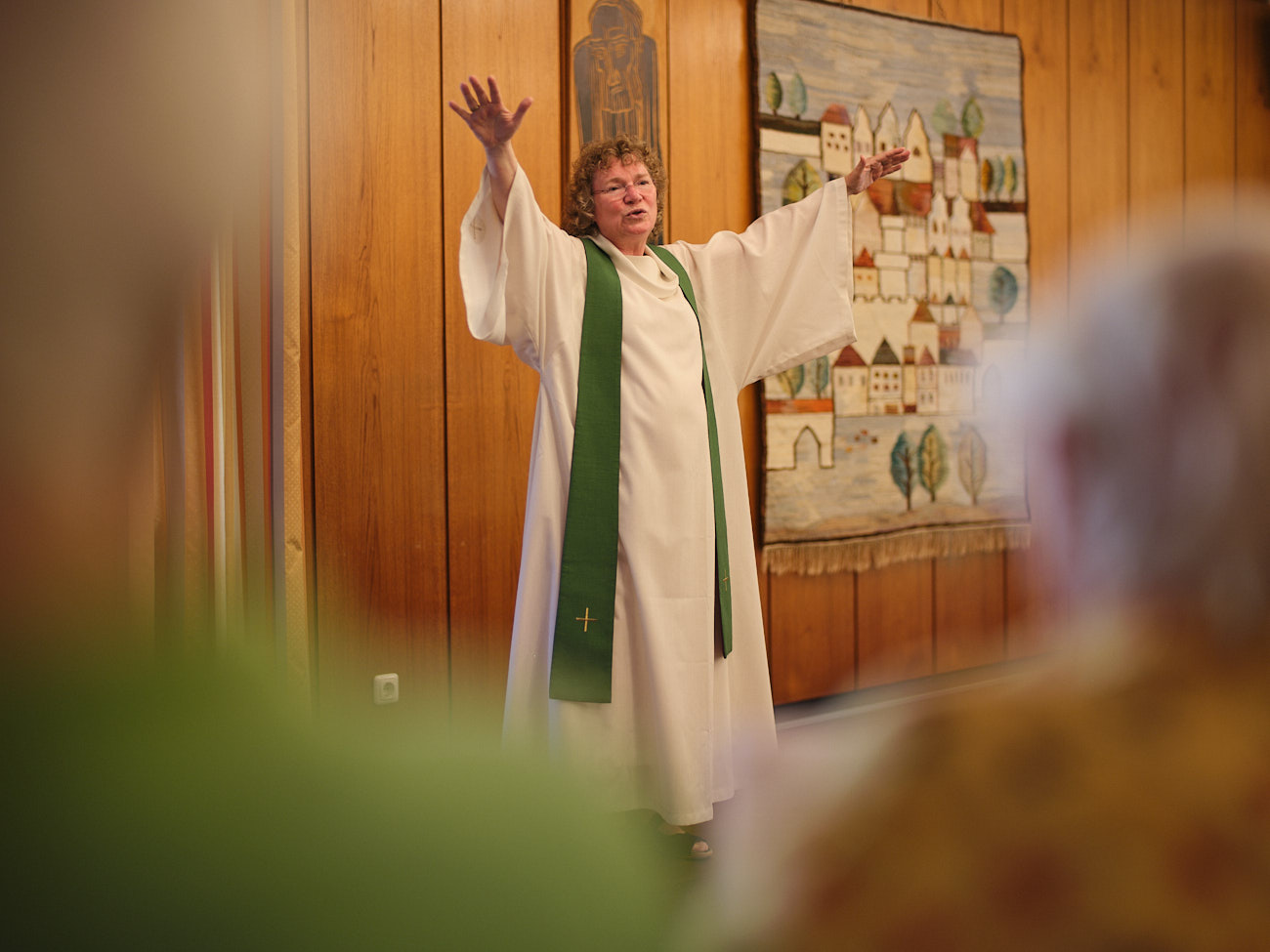Unsere langjährige Pastorin kommt einmal in der Woche ins Haus. Sie feiert mit uns Gottesdienst, macht Einzelbesuche und übernimmt seelsorgerische Aufgaben. Dabei betreut sie nicht nur Bewohnerinnen und Bewohner, sondern auf Wunsch auch Mitglieder des Teams bei psychosozialen Belastungen. Eingebettet in die Kirchengemeinde gibt es auch verschiedene Aktivitäten, etwa das Tanzcafé und Angebote zum Pilgern.